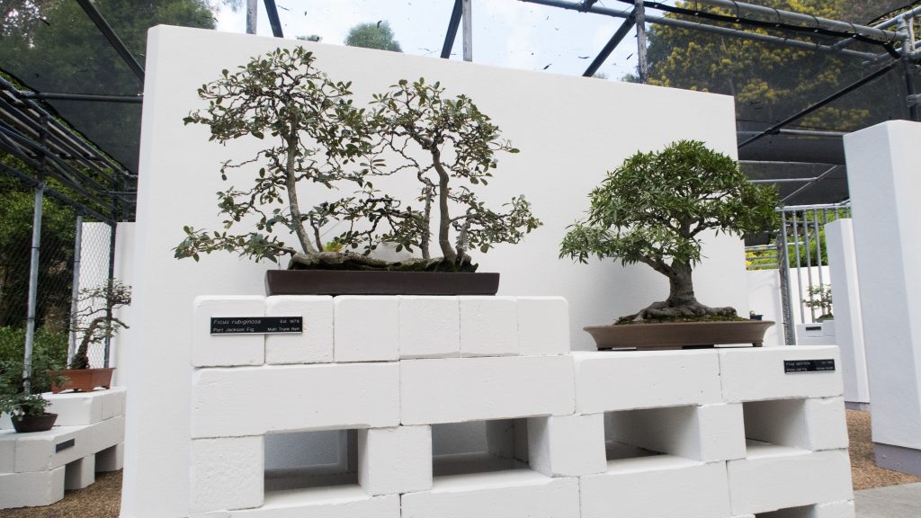 Apercevoir quelques bonsaïs (beaucoup de ficus en fait) dans la “maison des bonsaïs” dont le toit les protège des grosses intempéries.